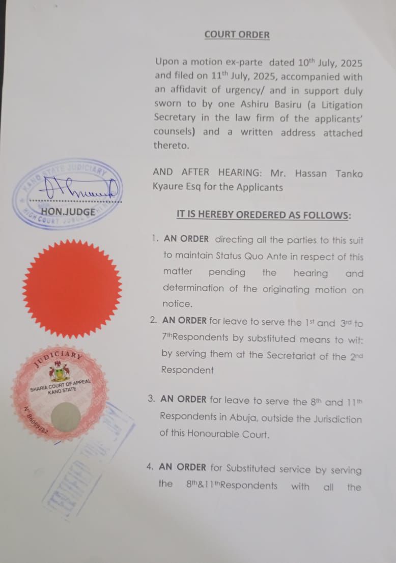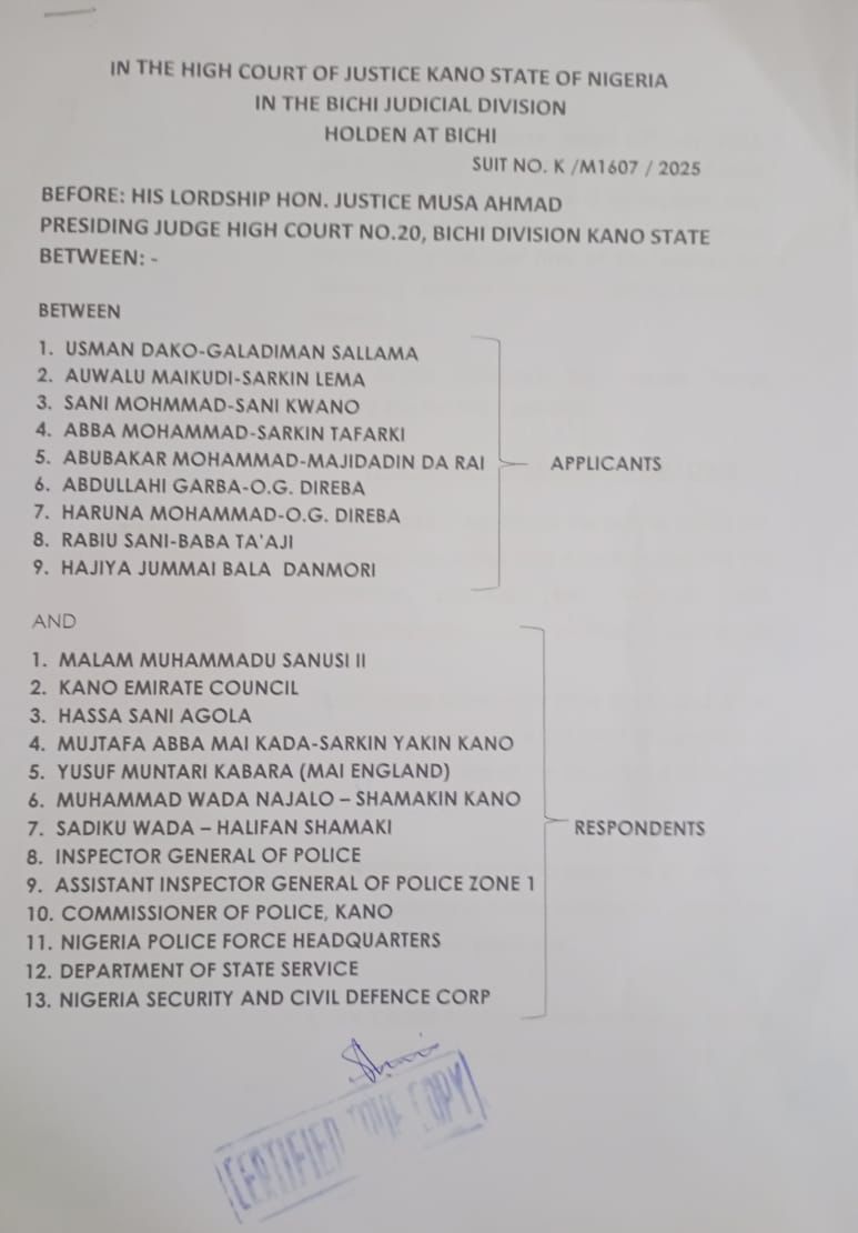 The suit, with case number K/M1607/2025, names Emir Muhammadu Sanusi II, the Kano Emirate Council, the Inspector General of Police, the Department of State Services (DSS), the Nigeria Security and Civil Defence Corps (NSCDC), and others as respondents.