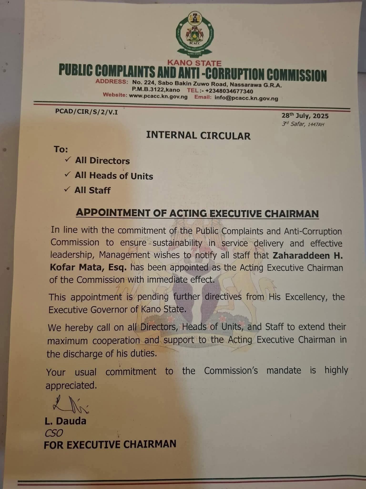 “In line with the commitment of the Public Complaints and Anti-Corruption Commission to ensure sustainability in service delivery and effective leadership, Management wishes to notify all staff that Zaharaddeen H. Kofar Mata, Esq., has been appointed as the Acting Executive Chairman of the Commission with immediate effect,” the circular stated.