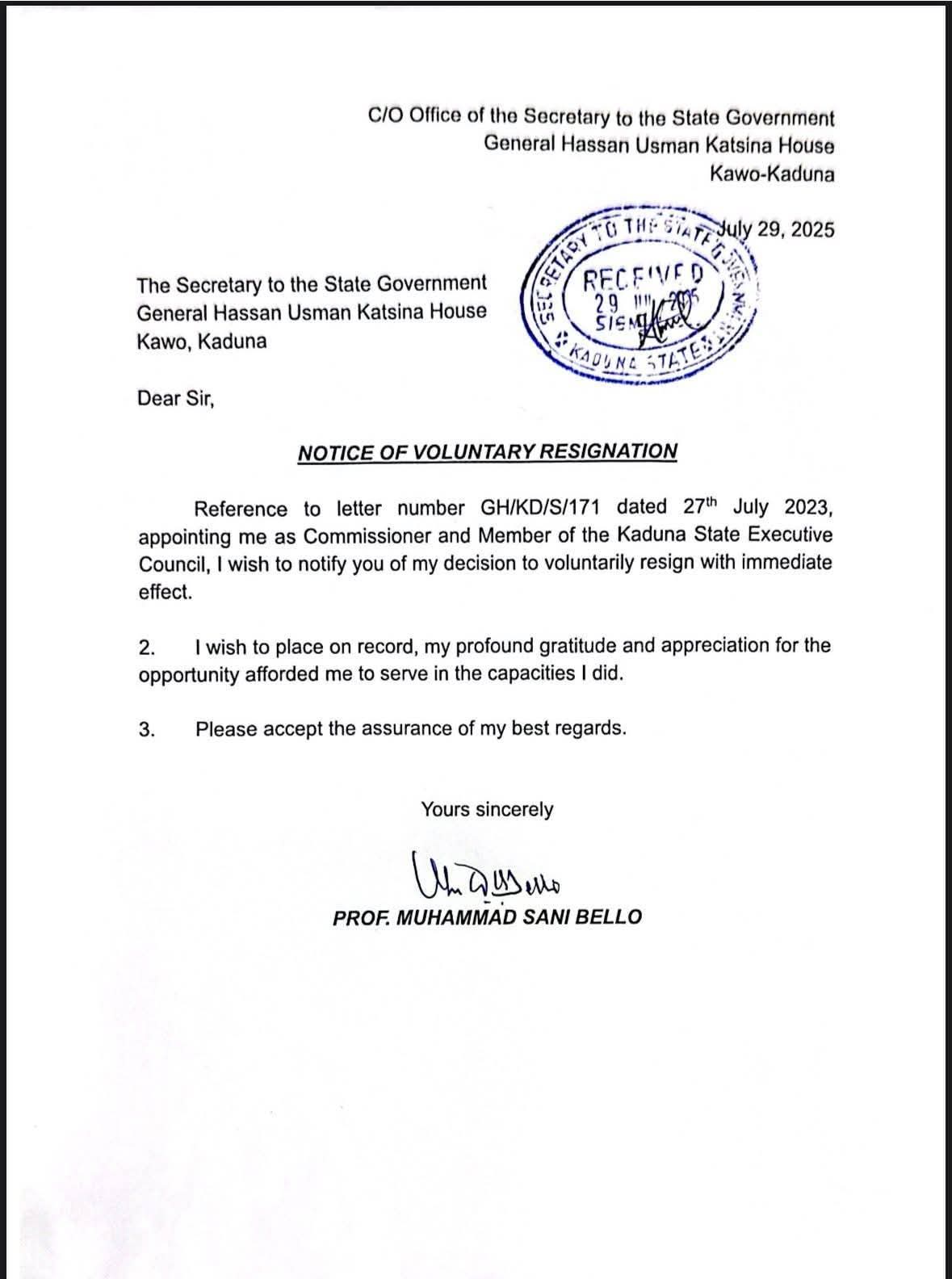 In a letter dated July 29, 2025, addressed to the Secretary to the State Government and titled Notice of Voluntary Resignation, Professor Bello referenced his appointment via letter GH/KD/S/171 dated July 27, 2023, and announced his resignation with immediate effect.