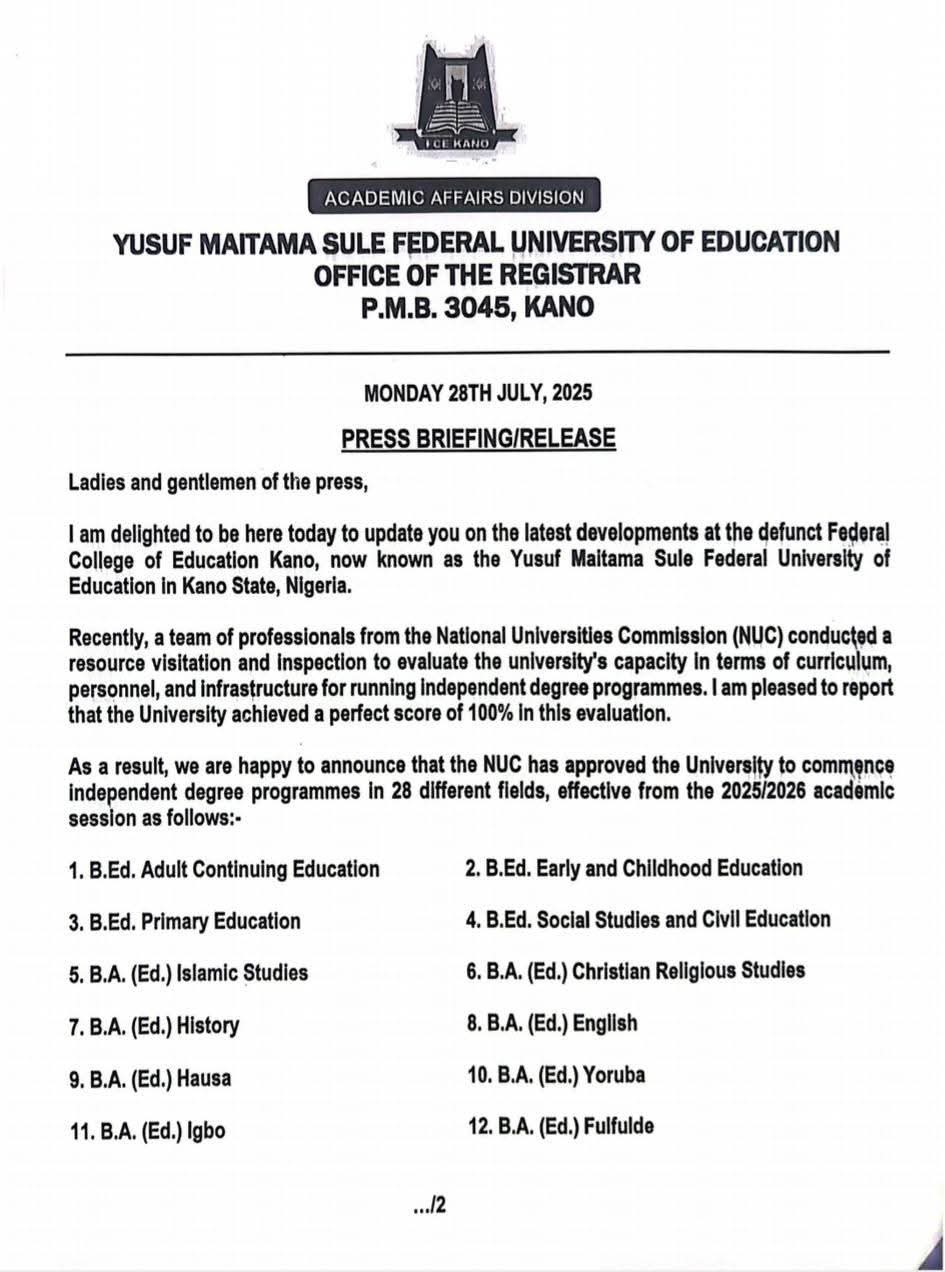 The Yusuf Maitama Sule Federal University of Education, formerly Federal College of Education, Kano, has received approval from the National Universities Commission (NUC) to commence full-fledged degree programmes starting from the 2025/2026 academic session.