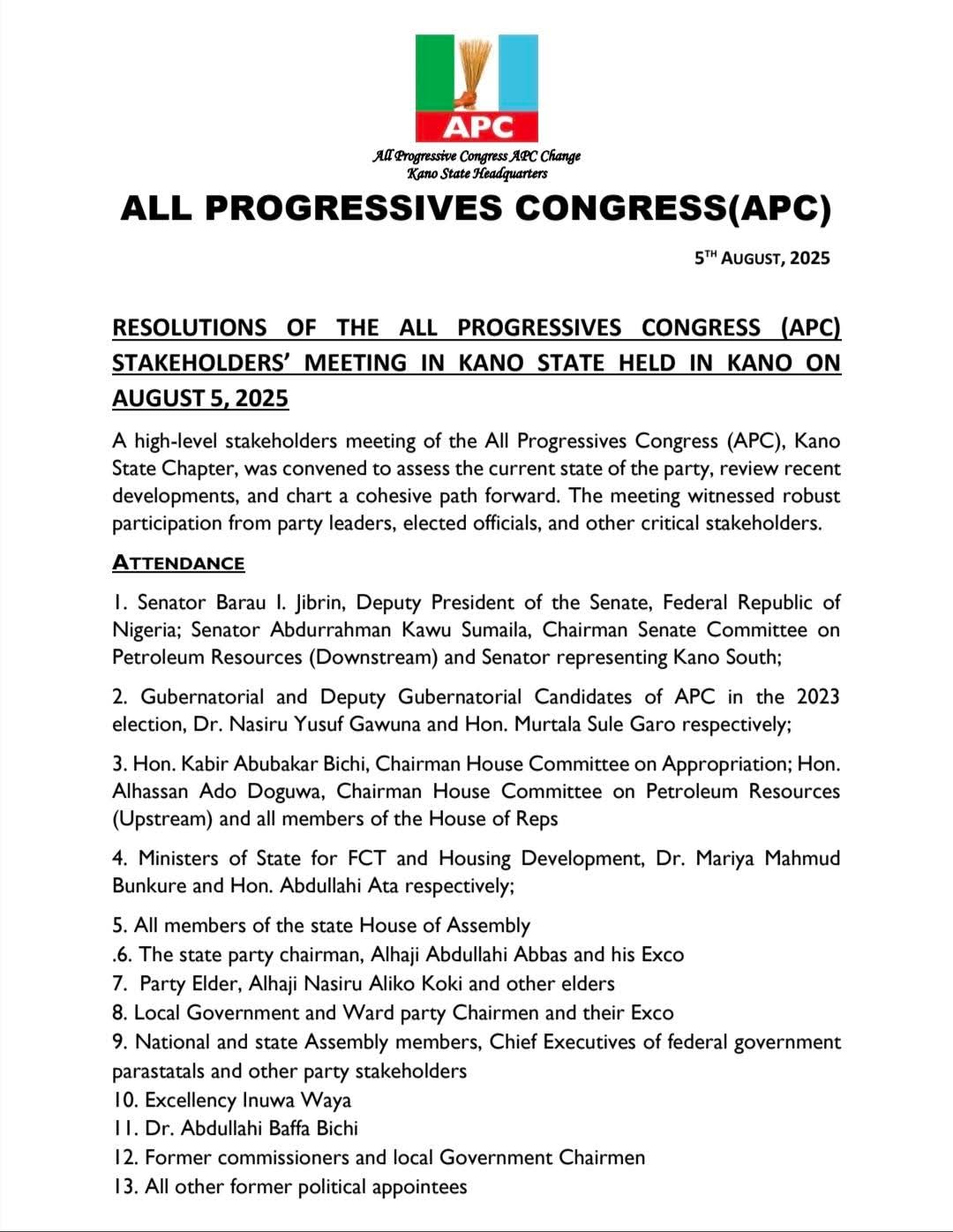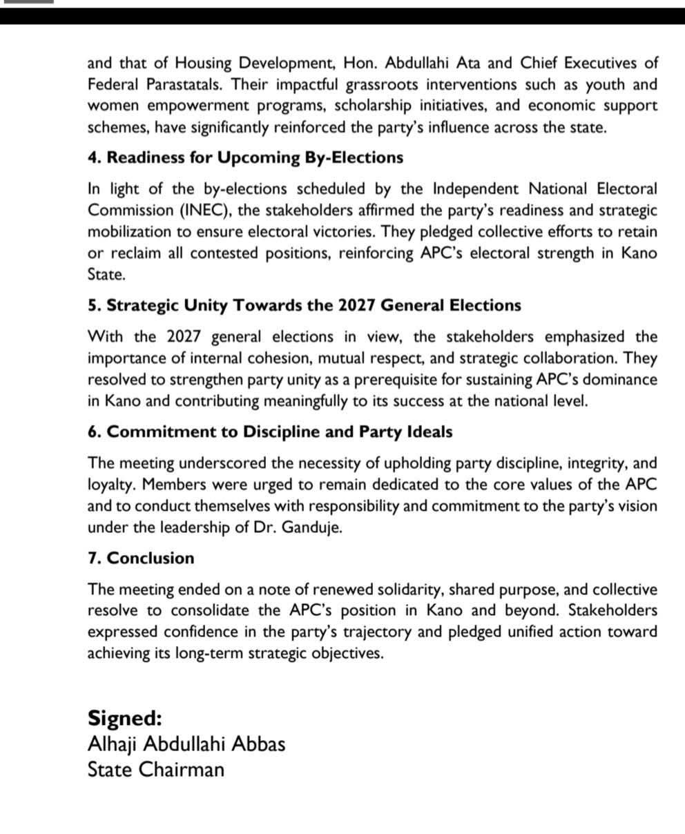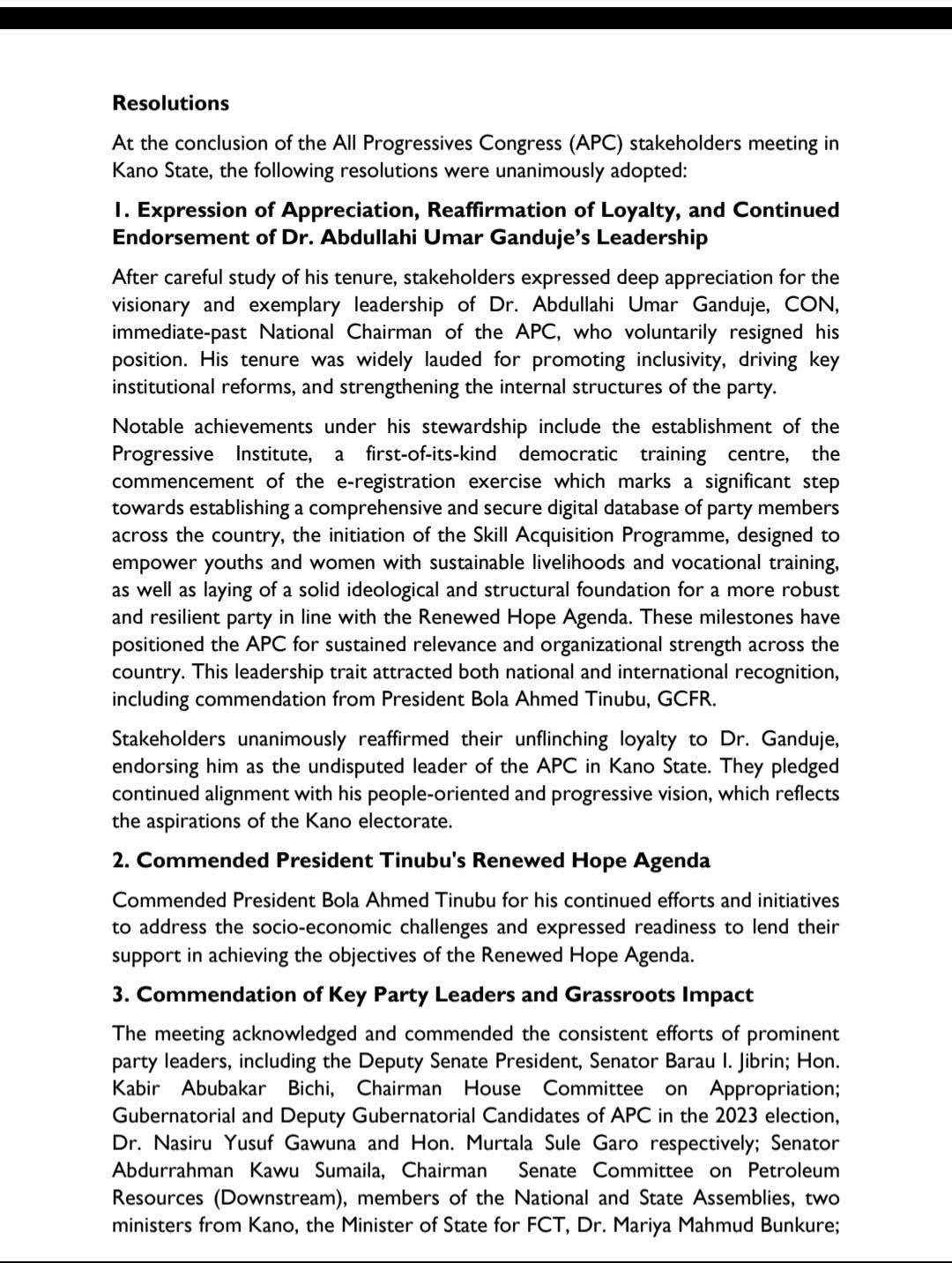 “Stakeholders unanimously reaffirmed their unflinching loyalty to Dr. Ganduje, endorsing him as the undisputed leader of the APC in Kano State,” it said.