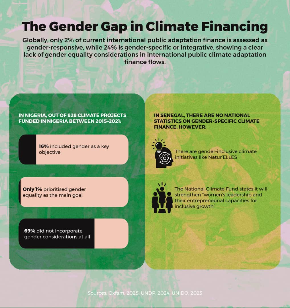 In Nigeria, even with a gender-climate action plan and a climate budget tagging system, rural women continue to be excluded from decisions and resources. In Senegal, despite having a national strategy for gender equity and equality since 2005, the green industry remains poorly gendered and under-documented.