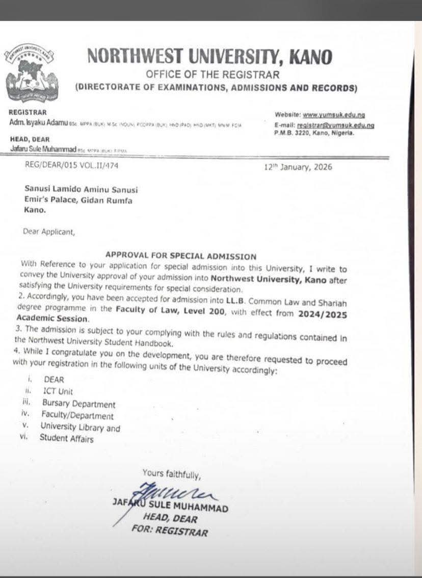 The letter, addressed to the Emir at Gidan Rumfa, Kano, stated, “With reference to your application for special admission into this University, I write to convey the University approval of your admission into Northwest University, Kano after satisfying the University requirements for special consideration. Accordingly, you have been accepted for admission into LL.B. Common Law and Sharia degree programme in the Faculty of Law, Level 200, with effect from 2024/2025 Academic Session.”
